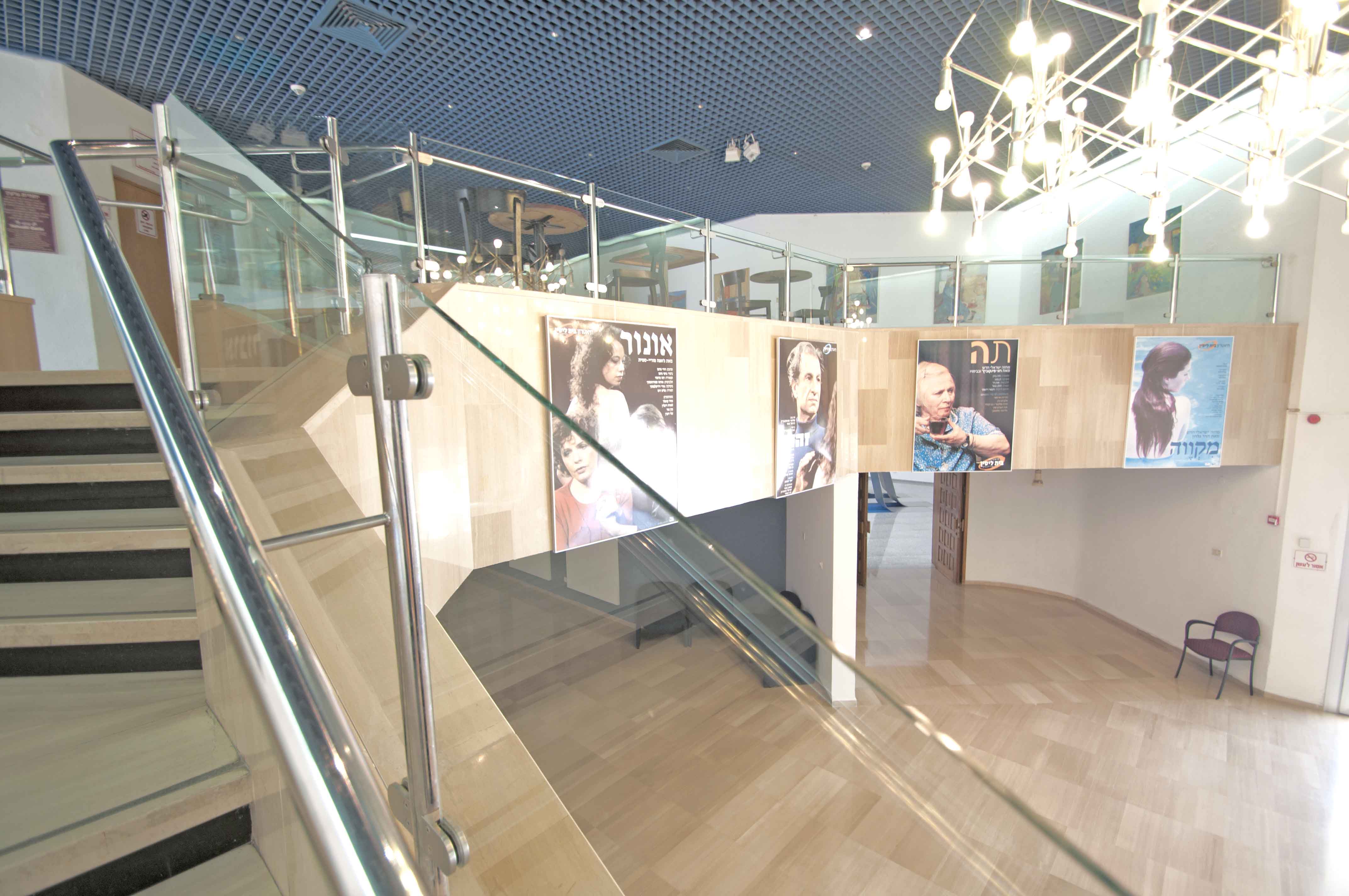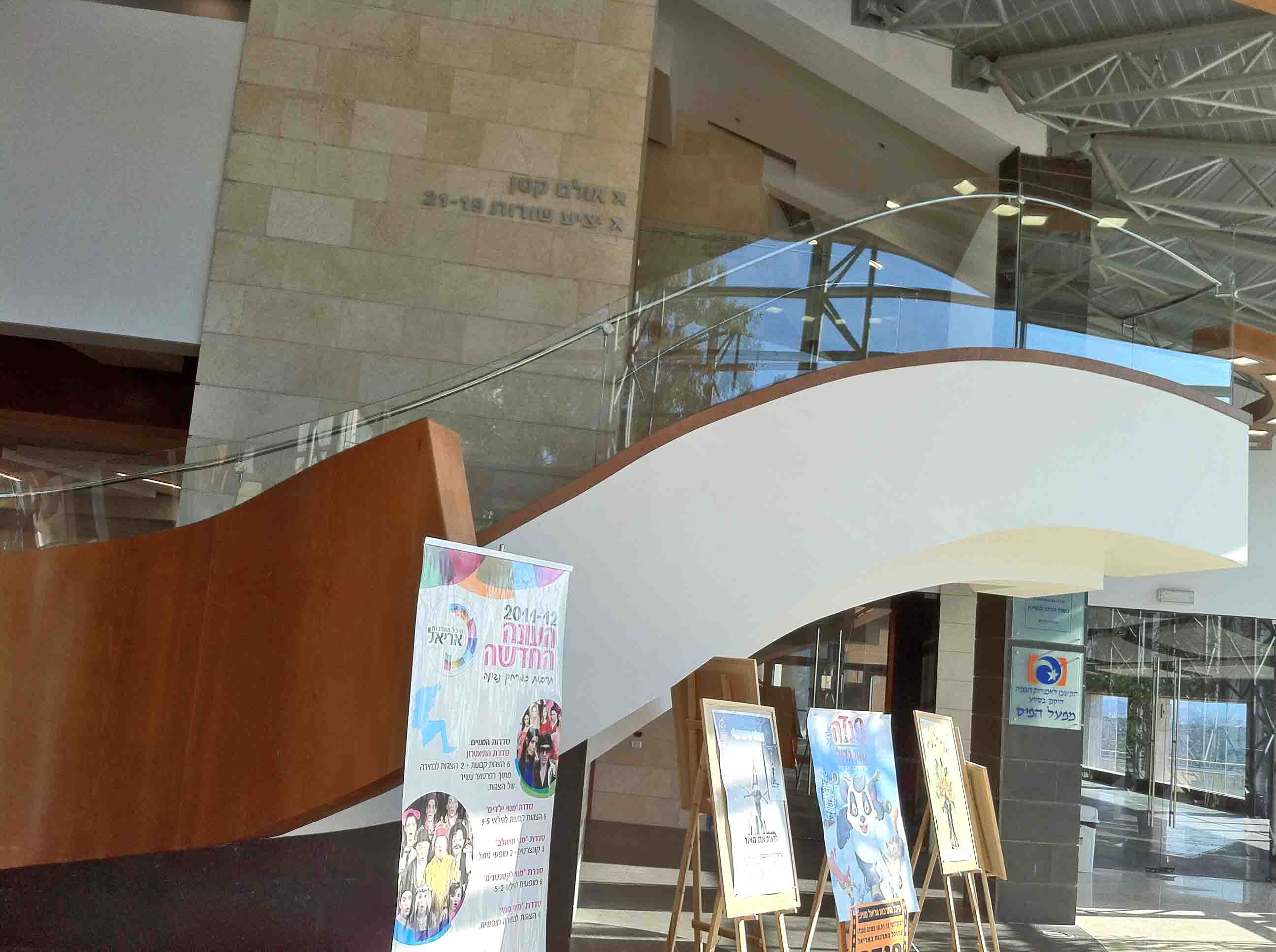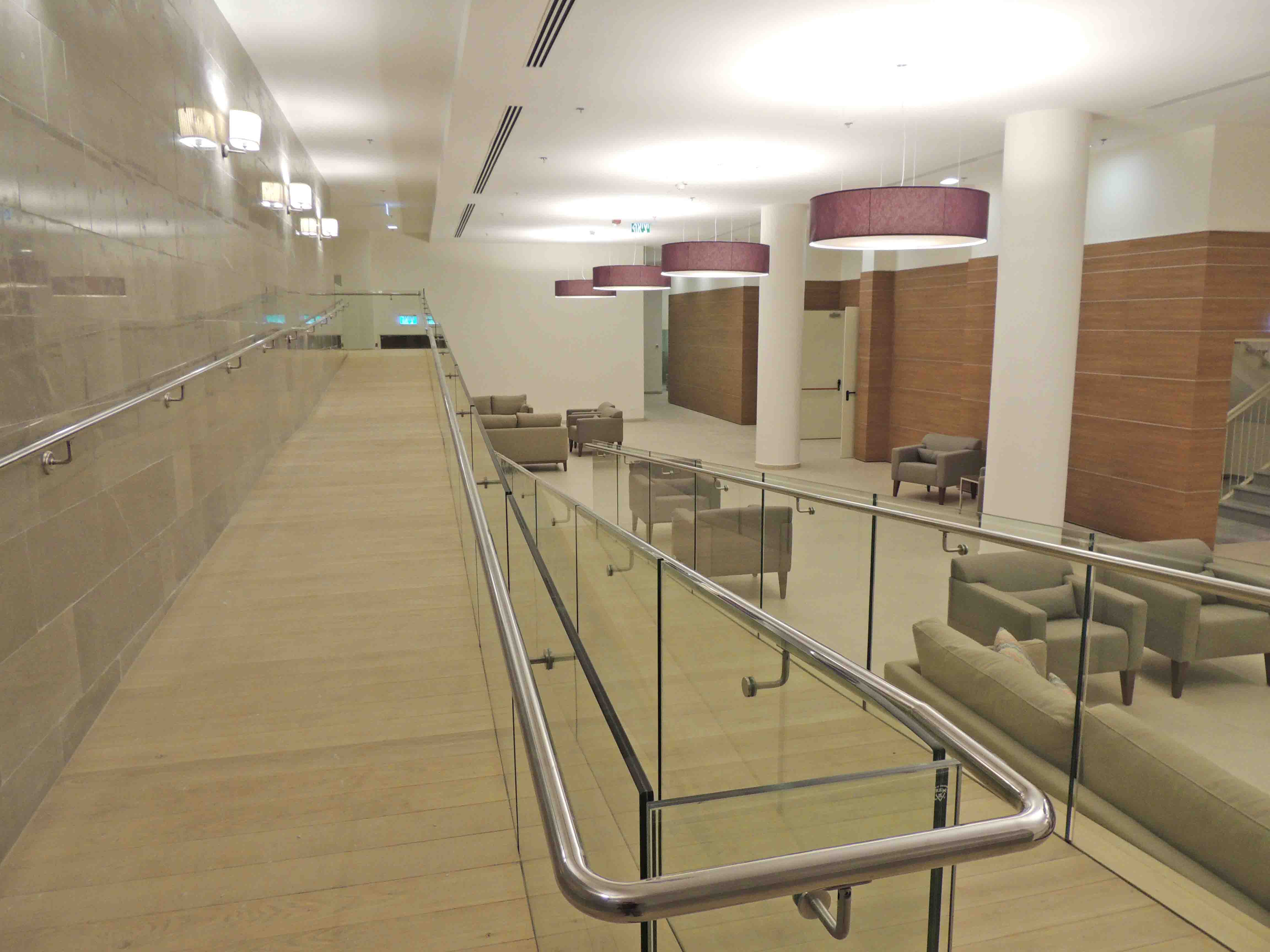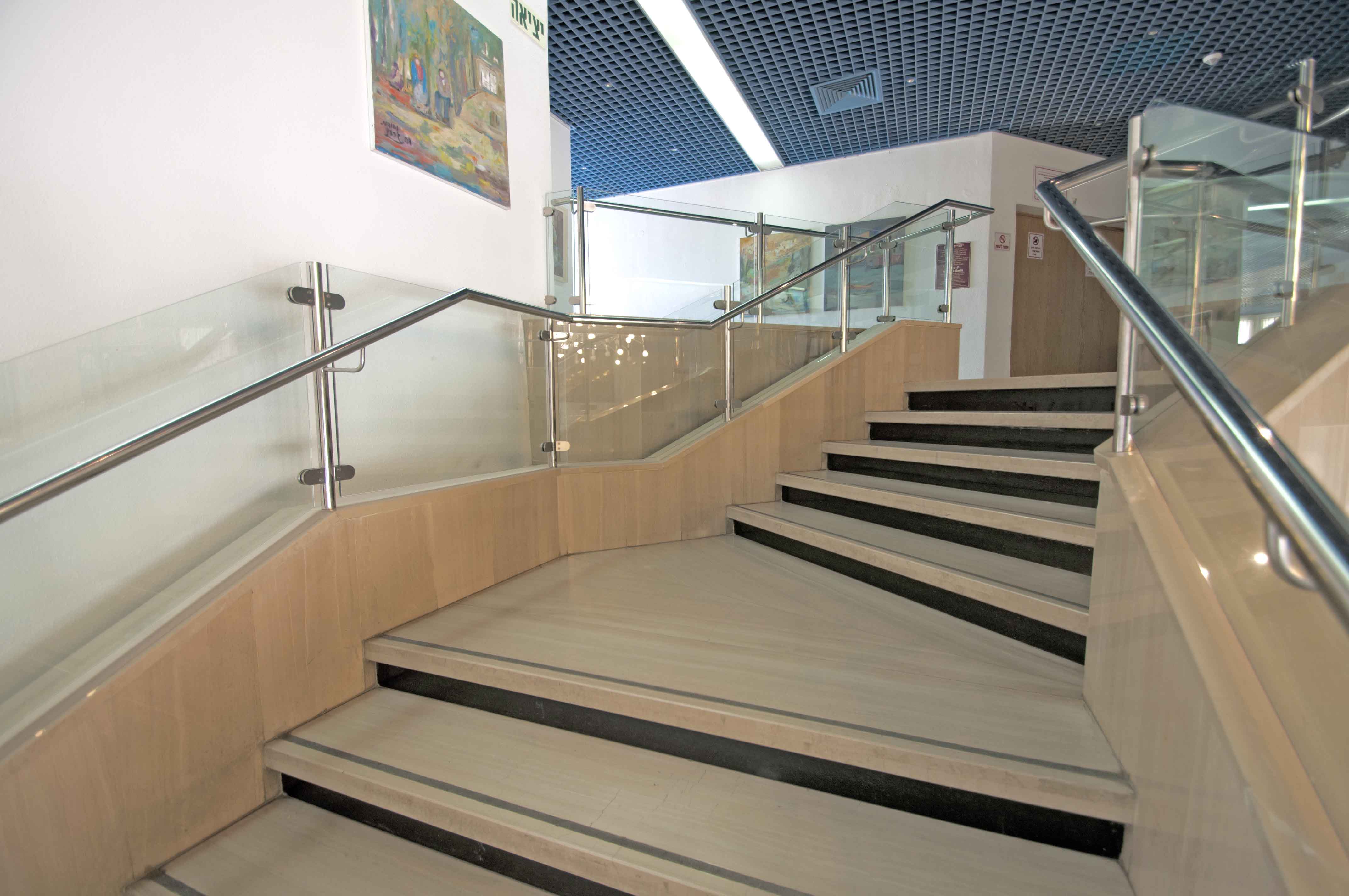 + אריאל היכל התרבות : מעקה זכוכית עם מאחז נירוסטה מעוגל לפי רדיוסים