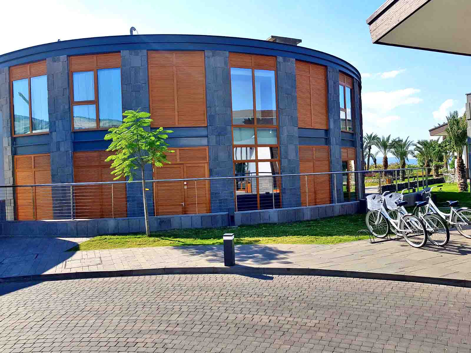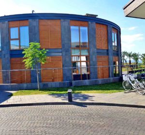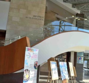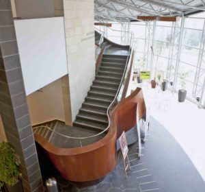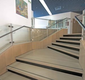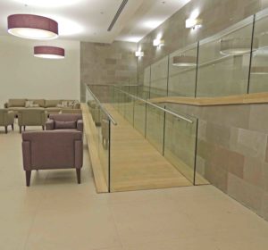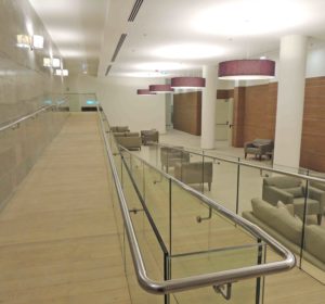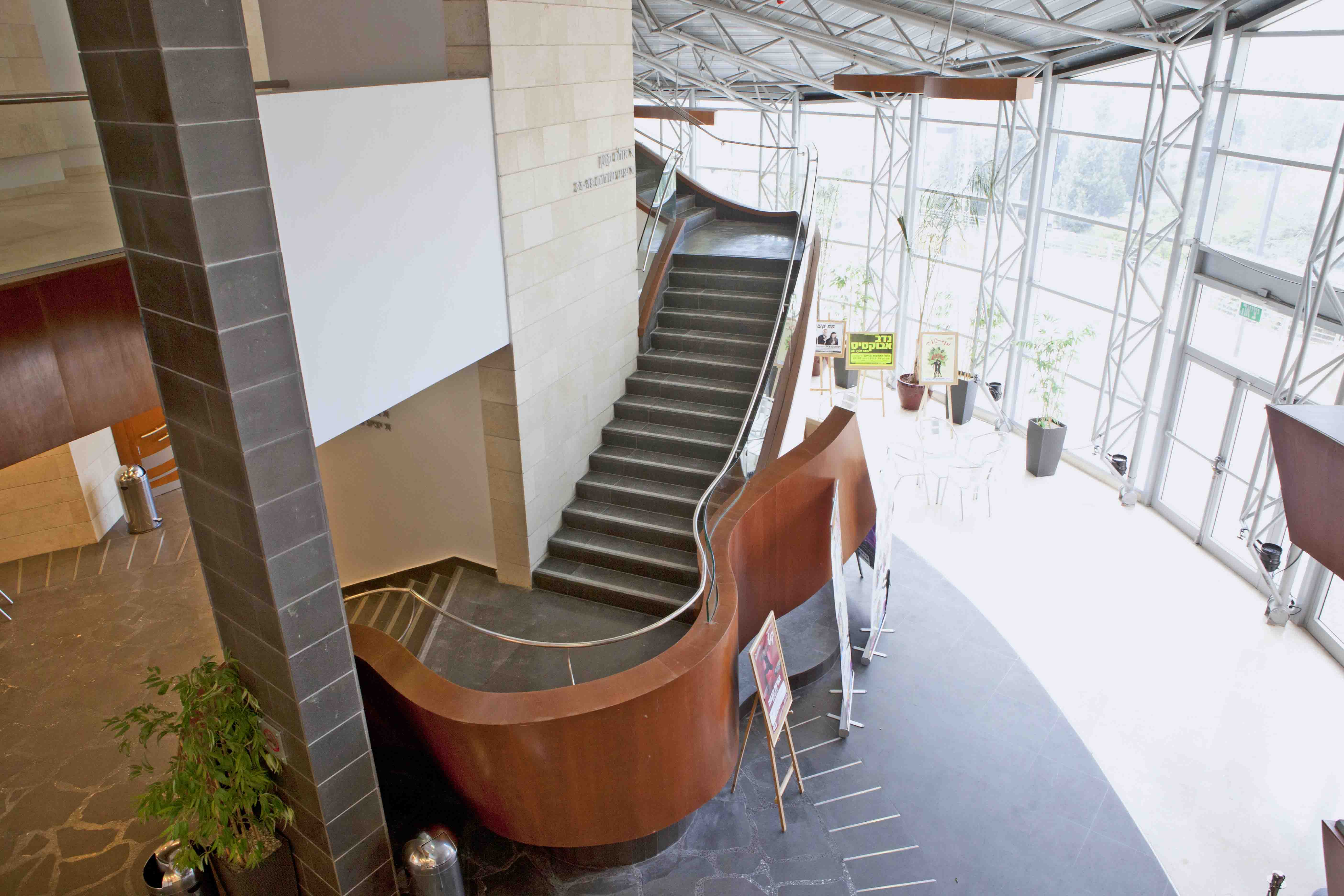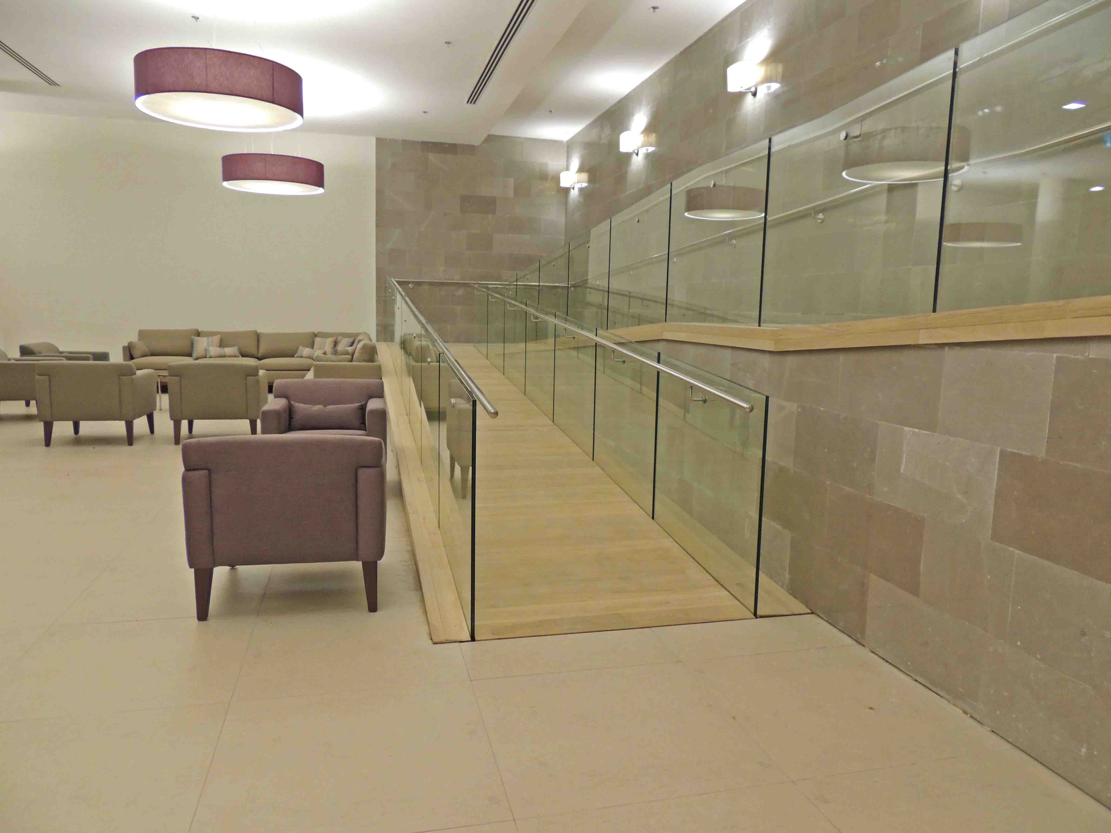 + אריאל היכל התרבות : מעקה זכוכית עם מאחז נירוסטה מעוגל לפי רדיוסים